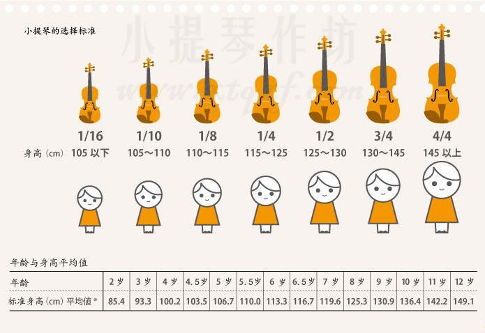 少年和儿童究竟选用什么规格的小提琴合适,目前还不能找出一个简单普遍且可遵循的规律,年龄只是大致的划分界线,并不是主要的依据,具体应该根据少年儿童的身高、臂长和手指条件来确定。
