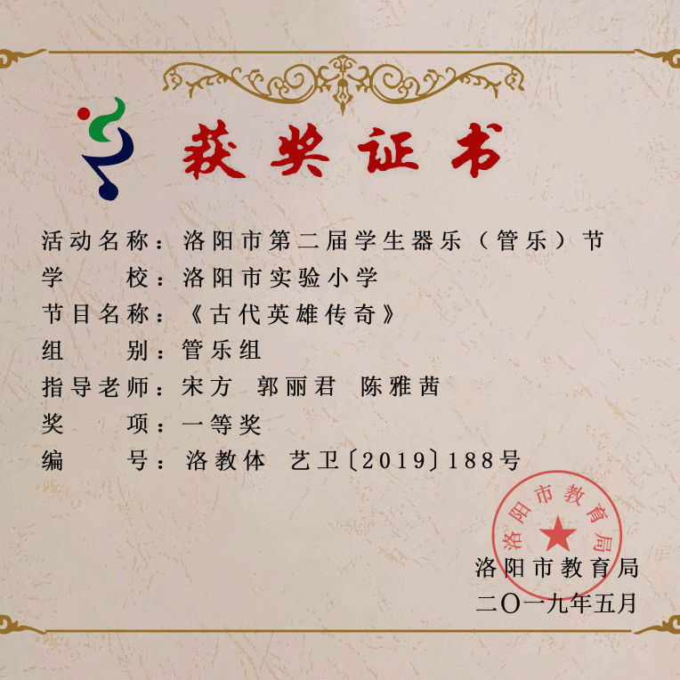 洛阳市第一实验小学校乐团自成立以来,一直秉承着全心全意教好孩子,满心满意服务家长的理念,培养乐团成员数百余名。曾带领优秀学员荣获洛阳市第二届学生器乐(管乐)节一等奖、洛阳市第13届中小学生艺术节一等奖。校乐团现已成为我校一张靓丽的名片。
