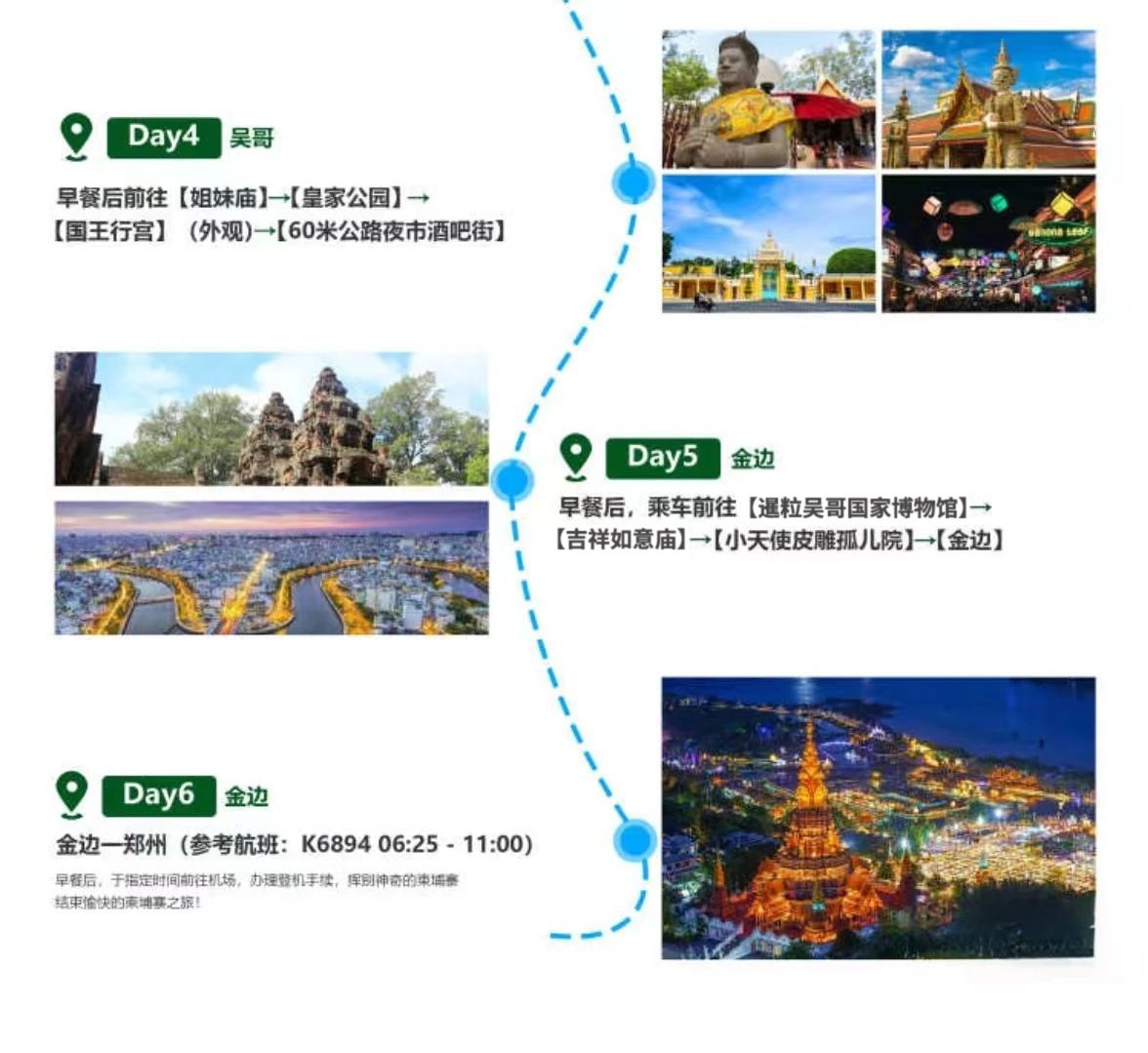 早餐后,前往【塔普伦庙 Ta Prohom】(游览约 60 分钟),电影《古墓丽影》、《花样年华》 以此为场景拍摄,有巨大的树木盘结在围墙庙门口, 更视为奇观。百年老树缠绕着千年奇石,彷佛爱恨纠缠般的浪漫。后前往游览【大吴哥城 Angkor Thom】(游览约 90 分钟),于城内参观加亚巴尔曼七世所遗留下来的建筑群,参观【巴戎庙 Bayon】,位于王城的中心点,由巨石佛群所组成, 亦代表当年版图的各诸侯领土,结构上也是以宇宙为中心点发展, 中间佛像位置最高,下一层则四周围绕其它四面巨石佛群,穿梭其中犹如置身于佛陀的世界。【斗象台】 是古代国王接见外宾的亭台,也是当时吴哥国王挑选坐骑与节庆时观赏斗象表扬的地方。【12 生肖塔】和中国的12生肖完全没有关系。亦称审判塔。参观名列世界七大奇迹【小吴哥Angkor Wat】(游览约 120 分)是高棉吴哥王朝全盛时期所遗留下来的不朽宗教建筑。此为高棉有史以来最宏伟的都城,也是200多座古迹中唯一正门向西的神庙。【小吴哥】始建于公元十二世纪,历时三十年,是整个吴哥古迹中最杰出、最辉煌的代表作,又有“雕刻出来的王城”的美誉。世界现存规模最大的古神殿,整体建筑共分为三层,在建筑设计建造和雕刻技术方面都具有极高艺术造诣,堪称人类文化史上的杰作!不愧为柬埔寨的骄傲,以至当今柬埔寨国旗上的国徽就是采用它的缩影。后参观游览【巴肯山】(停留时间约1小时),它是小吴哥附近的一座山丘,海拔不足70米,但却是整个吴哥景区的制高点。山顶建有巴肯神殿,体现了当时高棉人对山的崇拜。如果天气允许,还可欣赏到壮观的吴哥落日,金色的阳光笼罩着被热带雨林围绕的千年古寺,此时此刻您一定会有穿越时空的奇妙感觉。鉴于 2024 年中国-柬埔寨人文交流年系列活动陆续展开,将特别安排与柬埔寨官方音乐机构合作交流活动,与当地音乐家进行交流互动,分享彼此的音乐创作经验,共同探讨如何推动中柬音乐文化的融合与创新。晚上在当地的音乐酒吧欣赏柬埔寨现代音乐表演。