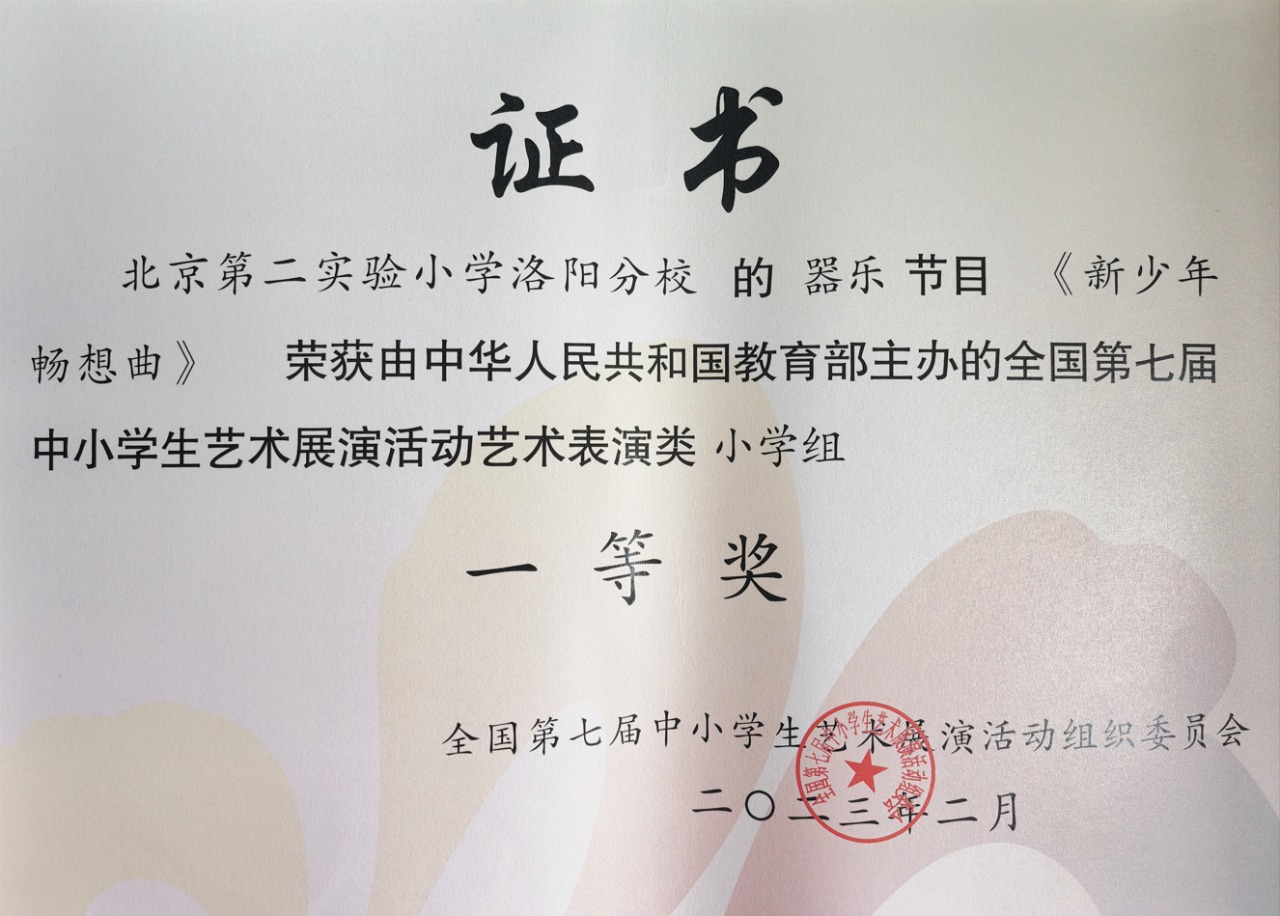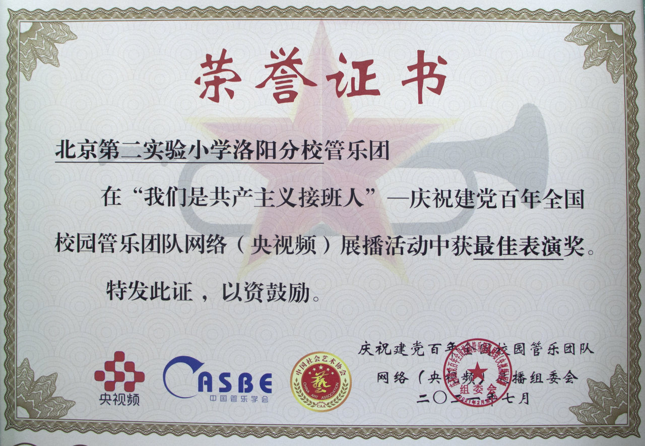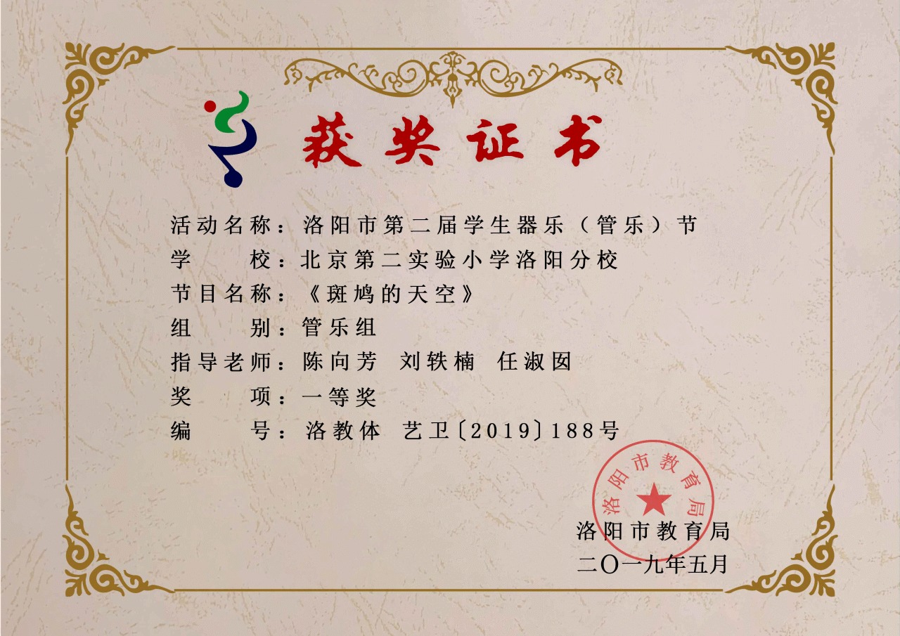 北京第二实验小学洛阳分校学生乐团多次在河南省学生器乐节比赛中获得一等奖,2018在“中华杯”中国第十二届优秀管乐团队展演中获得“示范乐团”最高荣誉称号,2023年在教育部举办的全国第七届中小学生艺术展演中荣获一等奖。历年来多次在市级比赛中取得优异成绩,得到省内专家的一致好评。