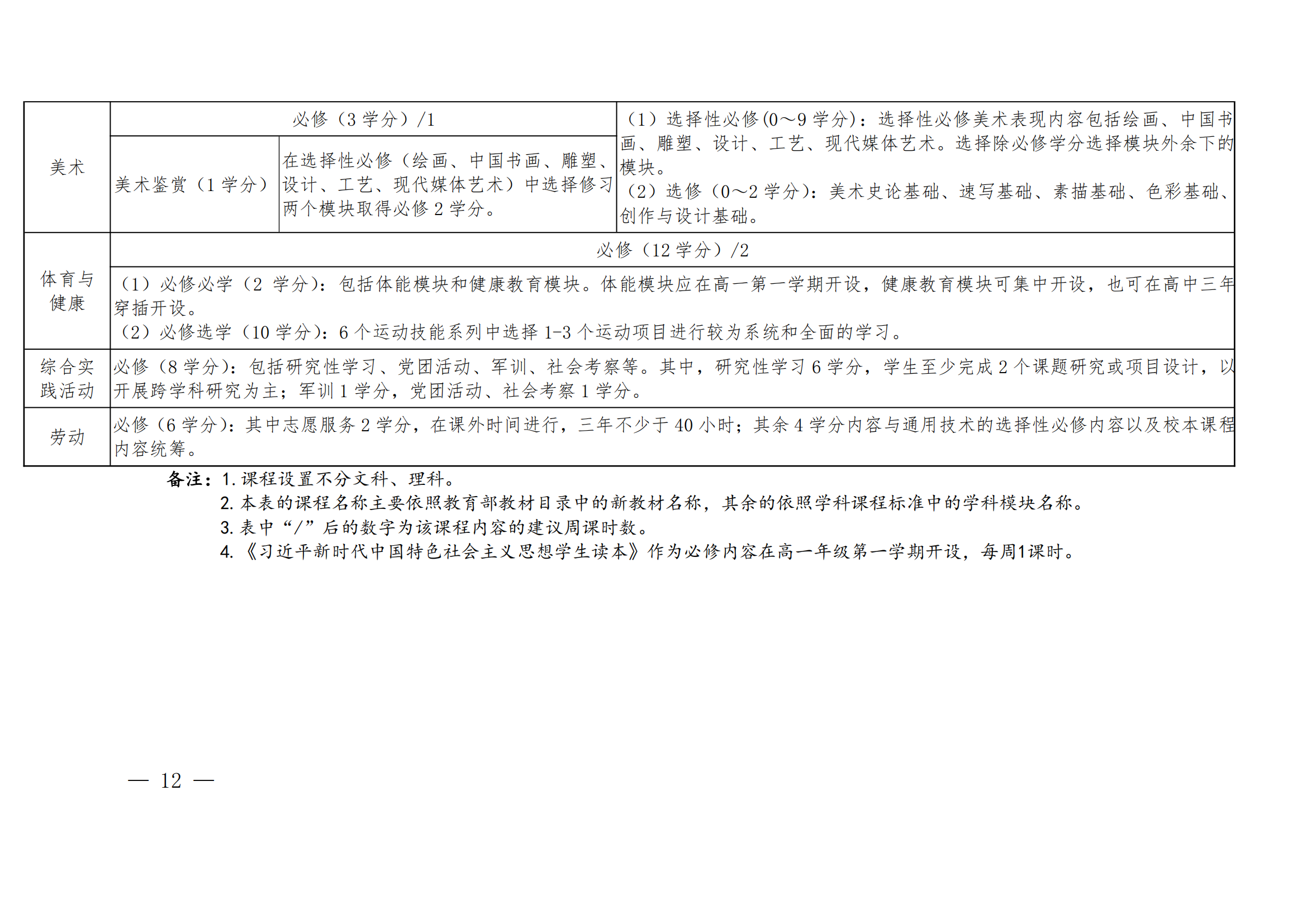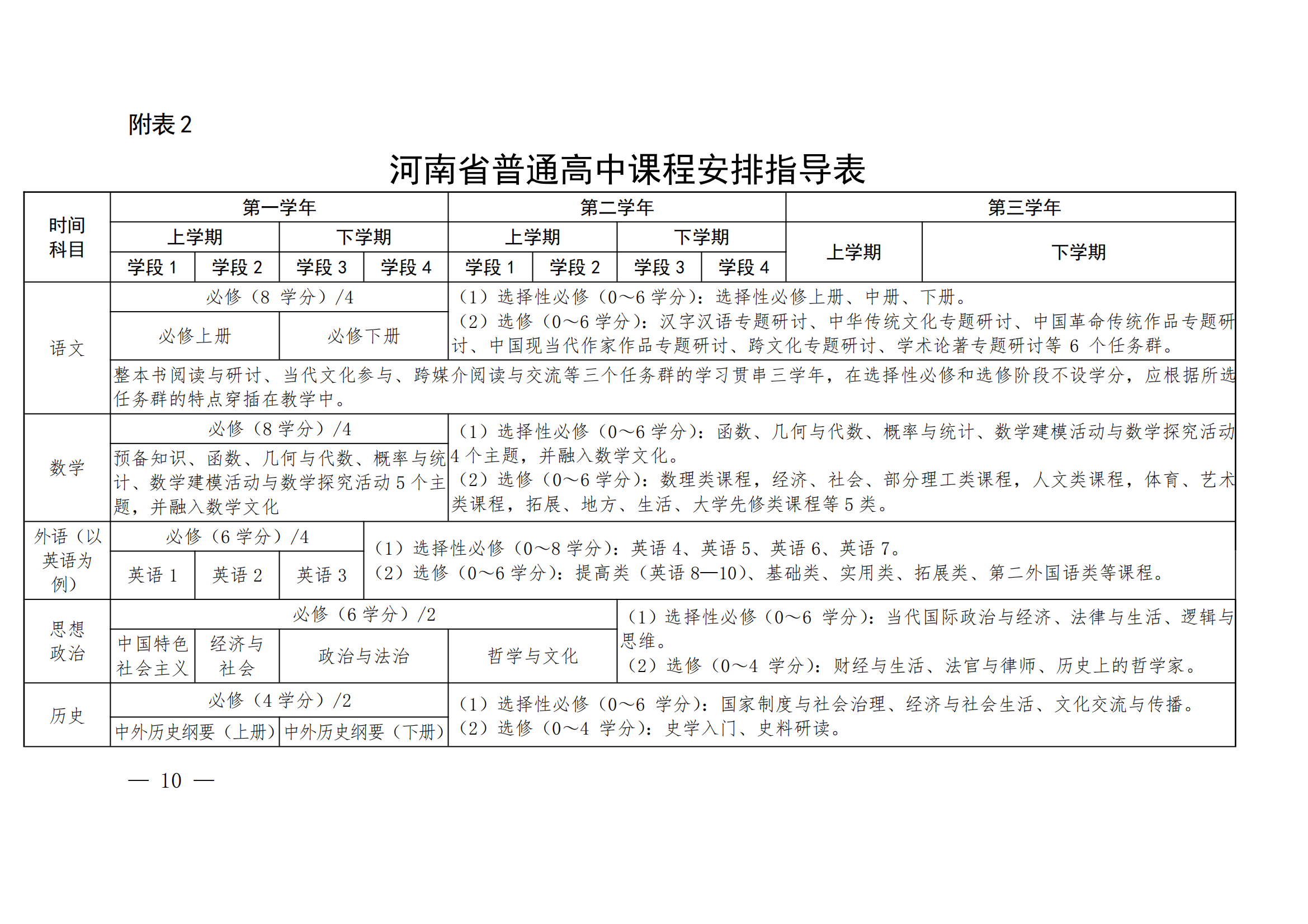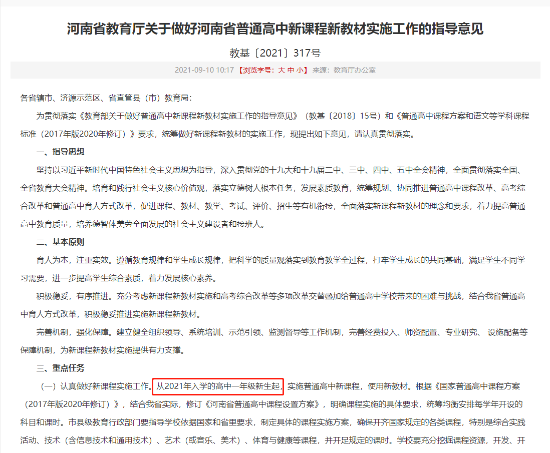 2021年9月,河南省教育厅印发《河南省普通高中课程设置方案(2021年修订)》、《关于做好河南省普通高中新课程新教材实施工作的指导意见》明确: