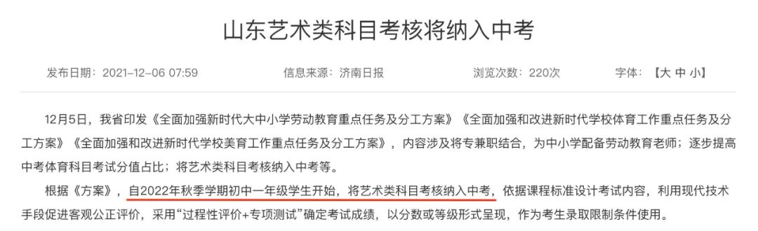 继2021年9月,河南省教育厅印发文件,明确自2021届高一新生开始将艺术纳入必修科目后,近日,山东省人民政府办公厅印发了学校美育工作重点任务及分工方案的通知,《方案》涉及将艺术类科目考核纳入中考。